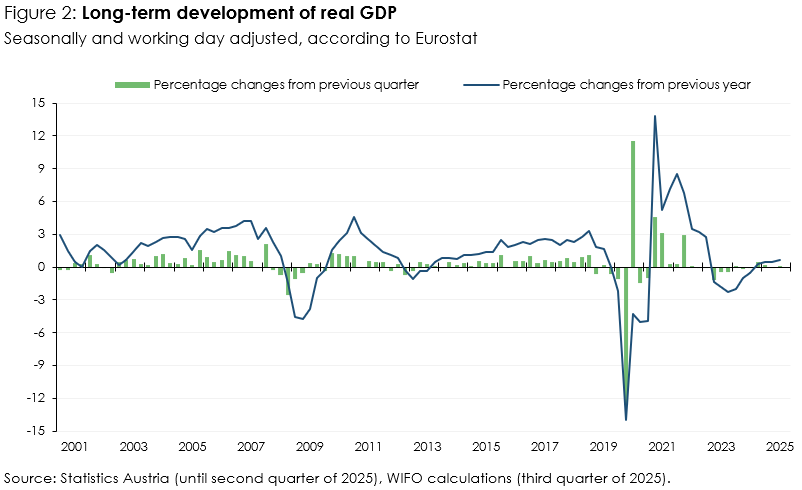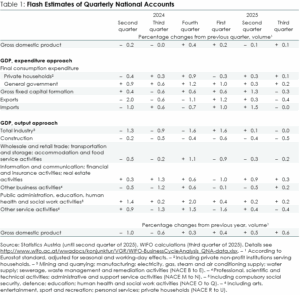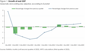 According to WIFO's latest Flash Estimate, Austrian economic output expanded by 0.1 percent in volume terms in the third quarter of 2025 compared with the previous quarter. There was sluggish momentum across the board. Both industry and services developed modestly. While consumer demand stabilised slightly, investment and foreign trade had dampening effects.