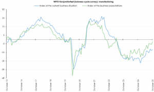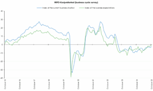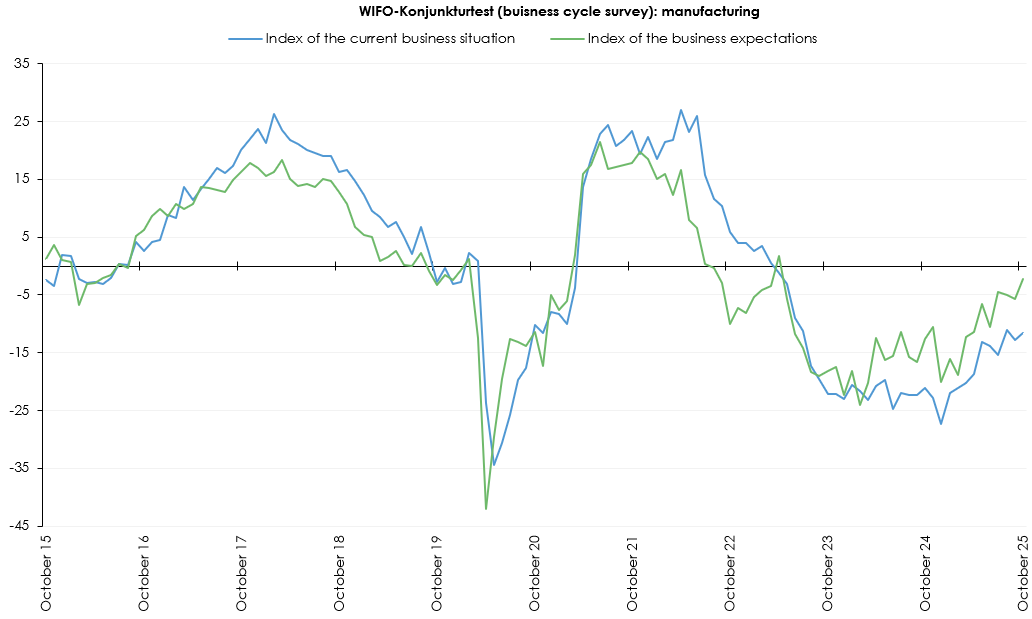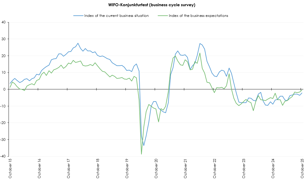 The index of business expectations for the economy as a whole also increased in October (+1.2 points) and remained just below the zero line that separates negative from positive economic expectations at –0.5 points. In the retail sector, the expectations index rose slightly (+1.0 points) and remained in the sceptical economic expectations range at –10.6 points. In the service sectors, the expectations index declined slightly (–0.3 points) but remained just in positive territory at 1.6 points. The construction industry showed an improvement (+1.9 points) and the expectations index stood at 4.4 points above the zero line. The expectations index also rose in October in the manufacturing sector (+3.5 points), but remained in the sceptical economic expectations range at –2.2 points.
