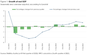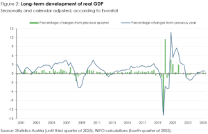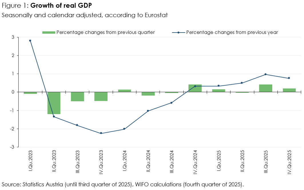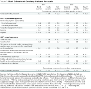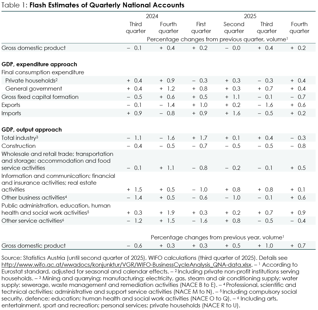 The WIFO Flash Estimate is an initial estimate for the previous quarter. It is based on Statistics Austria's quarterly accounts and covers GDP and its main components. These are calculated in the form of seasonally and calendar-adjusted rates of change compared with the previous quarter (key figure according to Eurostat specifications). The adjusted values for the previous quarters are not revised in this calculation, but continue to correspond to those of the latest publication by Statistics Austria. On 5 March 2026, Statistics Austria will publish the quarterly data for GDP and main aggregates for the fourth quarter of 2025 based on more recent data.
