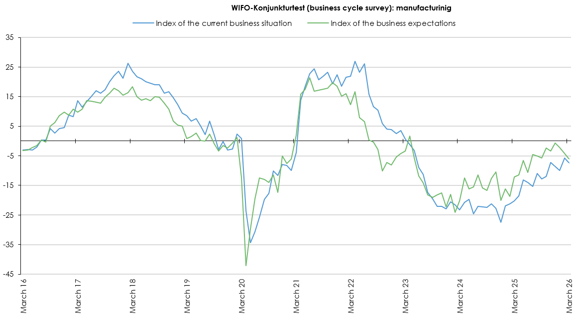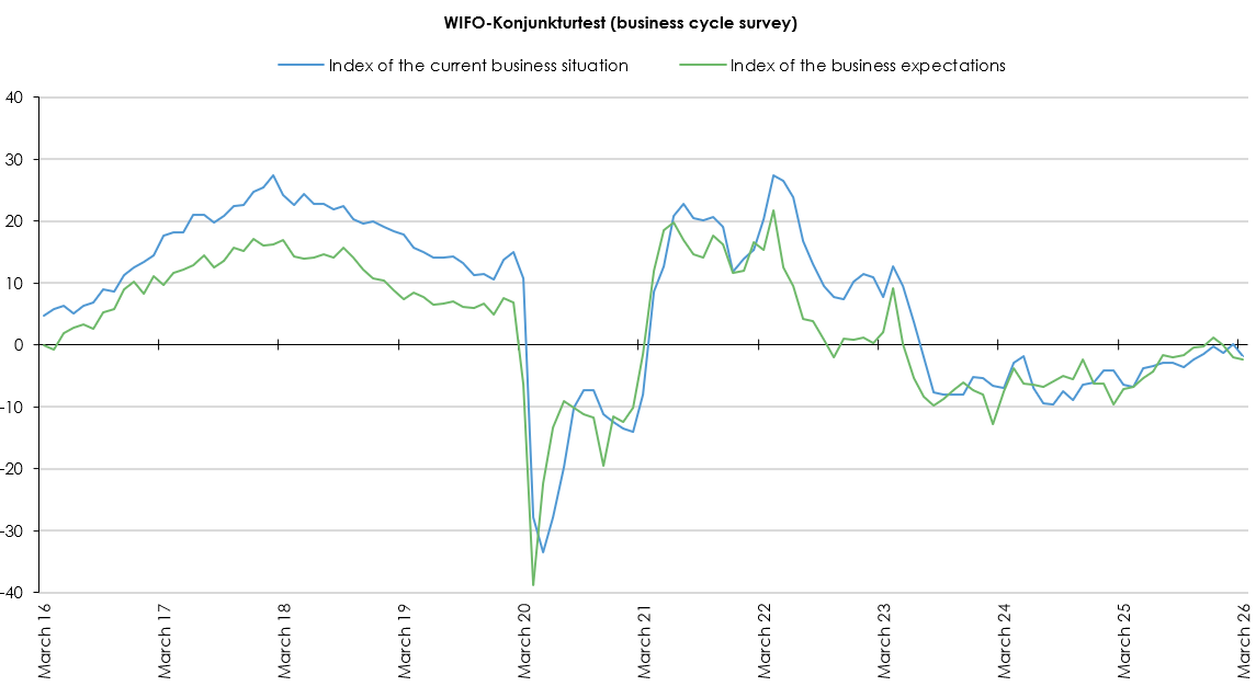 The index of business expectations for the overall economy fell slightly in March (–0.2 points) and, at –2.3 points, remained below the zero line that separates negative from positive economic expectations. In the retail sector, the expectations index fell (–1.5 points) and stood at –11.7 points, indicating sceptical economic expectations, though at a level typical for the retail sector. In the services sector, too, the expectations index fell (–0.5 points), but remained just above the zero line at 0.7 points. The construction sector showed an improvement (+4.8 points); the expectations index stood at 2.1 points, above the zero line. In manufacturing, however, the expectations index declined in March (–1.7 points) and, at –6.0 points, was once again lower in the range of sceptical economic expectations.
