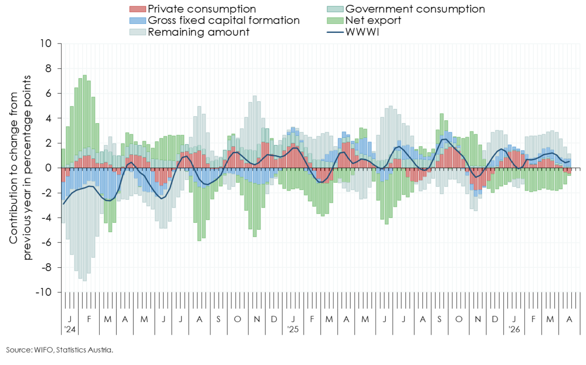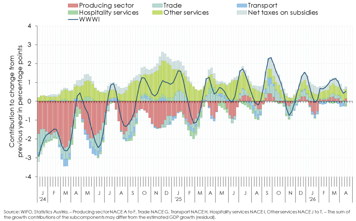 The industrial production index rose significantly in December 2025 compared with the previous year, but in January 2026 (revised) it was below the previous year's level. Growth was observed again in February 2026, based on preliminary data. Employment in the goods-producing sector (NACE 2008, sections A to E) continued to fall (February and March –1 percent year-on-year in each case). The number of jobseekers in this sector rose slightly again in the following months after a brief easing at the turn of the year 2025-26. According to the WIFO-Konjunkturtest, sentiment among manufacturing companies improved until the start of 2026, but on balance, assessments remained in negative territory. Most recently, assessments have deteriorated (significantly) again. WIFO estimates that economic output in the goods-producing sector was 1¼ percent higher than in the previous year in both February and March, and ½ percent higher in the first three weeks of April.