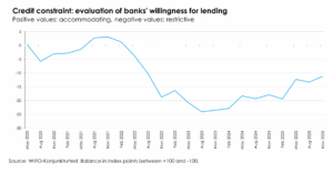 In November 2025, companies' assessments of banks' willingness to lend – defined as the balance of the proportion of companies that describe banks' lending as accommodative (positive values) and the proportion of companies that describe bank lending as restrictive (negative values) – improved slightly compared with the previous quarter (+2.1 points), but remained in negative territory at –11.2 points. There are differences depending on company size: the credit hurdle is higher for smaller companies (fewer than 50 employees) (–14.6 points) than for medium-sized companies (50 to 250 employees: –4.6 points) and large companies (more than 250 employees: –8.7 points).
