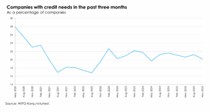 The survey results show a slight decline in credit demand (–1.1 percentage points compared with the previous quarter) with a value of 20.2% (long-term average: 20.8%) in aggregate (excluding retail). In manufacturing, credit demand remained above average (22.1% of companies reported credit demand), while in retail (20.5%) it fell slightly. Credit demand in the service sectors (19.4% of companies) and in construction (17.7%) was average or slightly below average. By company size (excluding retail), 18.9% of smaller companies (fewer than 50 employees) reported a need for credit, compared with 24.6% of medium-sized companies and 21.9% of larger companies (more than 250 employees).