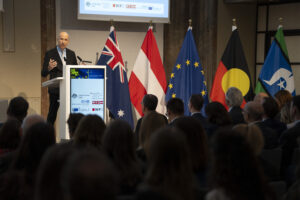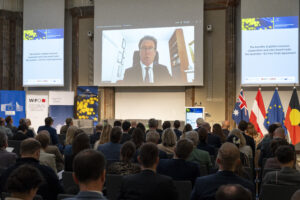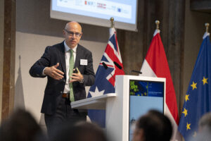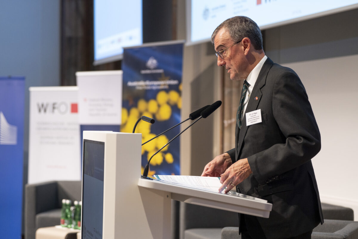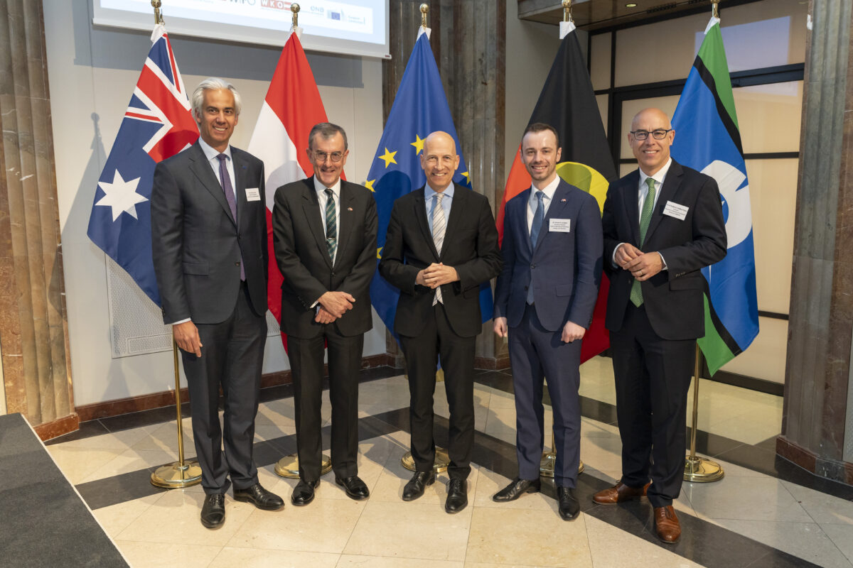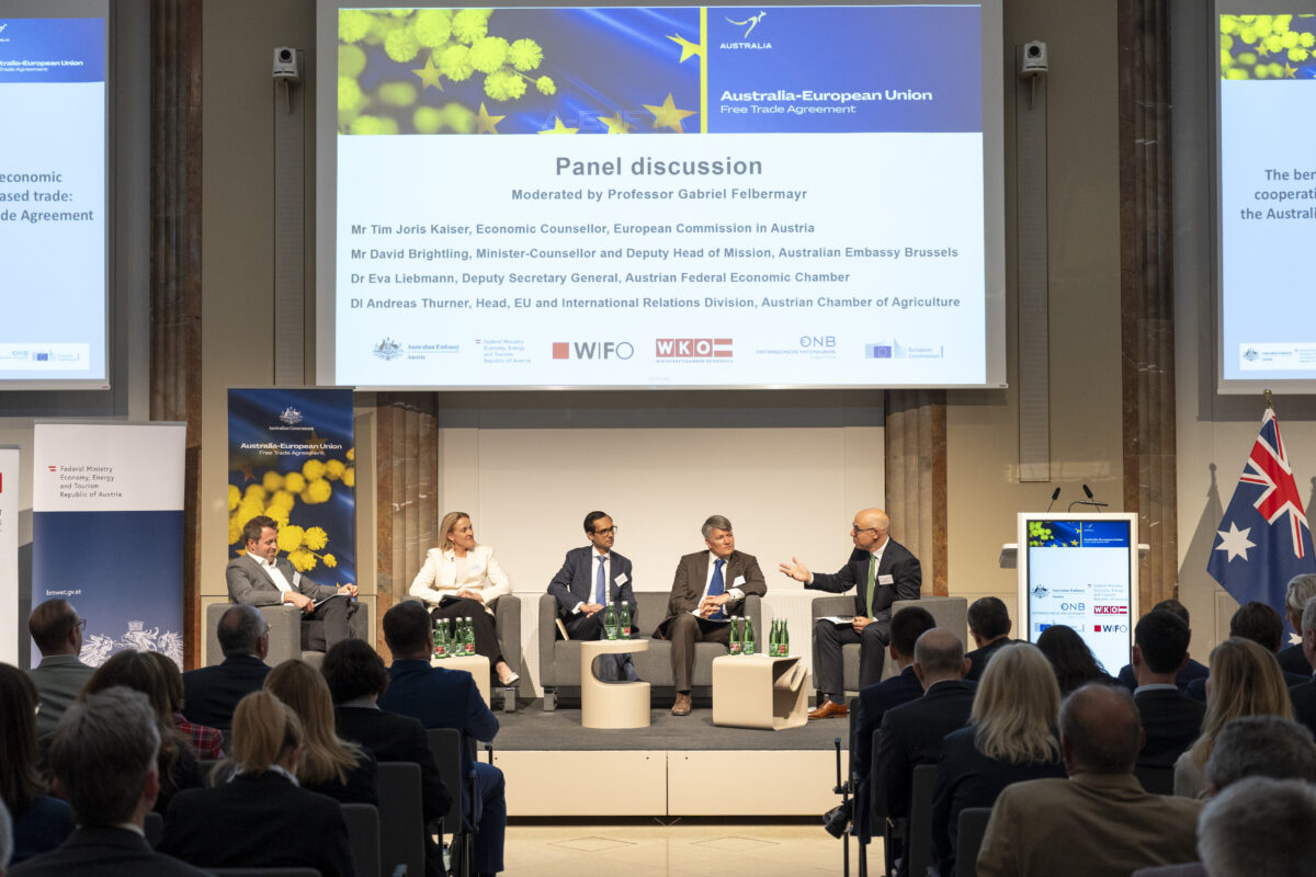 OeNB-Gouverneur Prof. Martin Kocher und Australiens Botschafter in Österreich Ian Biggs eröffneten die Veranstaltung in der OeNB. Hauptreferenten waren Dr. Severin Gruber (BMWET-Generalsekretär), Patrick Lobis (Leiter der Vertretung der Europäischen Kommission in Österreich), Gabriel Felbermayr (WIFO-Direktor) sowie Lachlan Crews (australisches Verhandlungsteam für das Freihandelsabkommen). Vertreterinnen und Vertreter des BMWET, der Landwirtschaftskammer Österreich, der australischen Botschaft in Brüssel, der Vertretung der Europäischen Kommission in Österreich sowie der WKO nahmen an einer von Felbermayr moderierten Expert:innendiskussion teil.