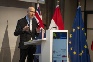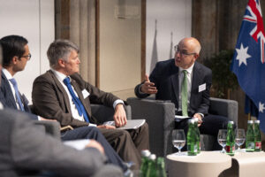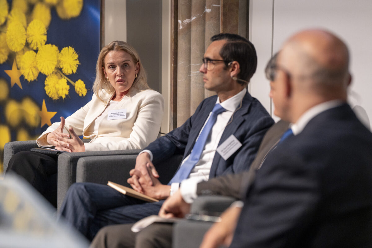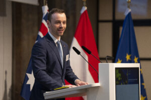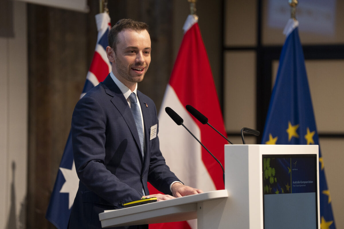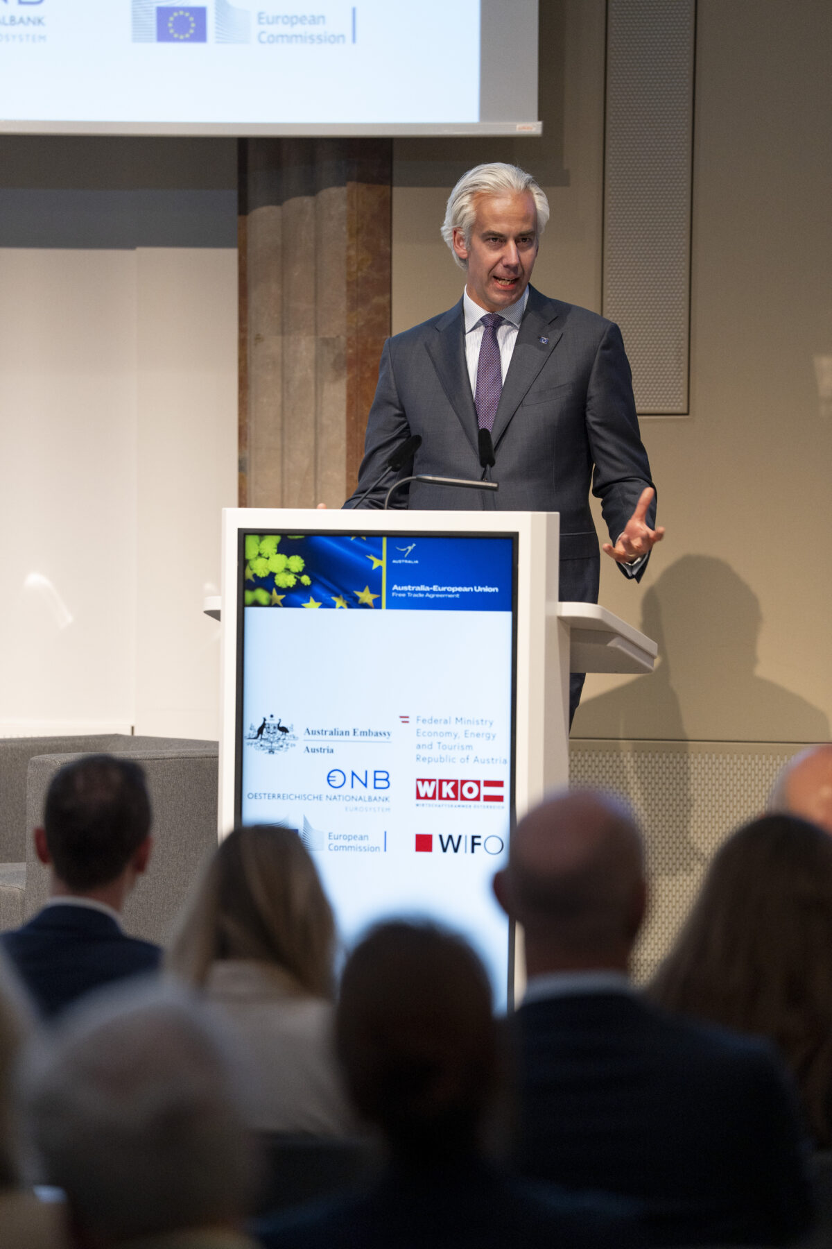 OeNB-Gouverneur Prof. Martin Kocher und Australiens Botschafter in Österreich Ian Biggs eröffneten die Veranstaltung in der OeNB. Hauptreferenten waren Dr. Severin Gruber (BMWET-Generalsekretär), Patrick Lobis (Leiter der Vertretung der Europäischen Kommission in Österreich), Gabriel Felbermayr (WIFO-Direktor) sowie Lachlan Crews (australisches Verhandlungsteam für das Freihandelsabkommen). Vertreterinnen und Vertreter des BMWET, der Landwirtschaftskammer Österreich, der australischen Botschaft in Brüssel, der Vertretung der Europäischen Kommission in Österreich sowie der WKO nahmen an einer von Felbermayr moderierten Expert:innendiskussion teil.