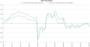 Der Index der unternehmerischen Erwartungen der Gesamtwirtschaft ging im April ebenfalls zurück (–4,4 Punkte) und notierte mit –6,9 Punkten wieder deutlich unter der Nulllinie, die negative von positiven Konjunkturerwartungen trennt. Im Einzelhandel sank der Erwartungsindex (–3,1 Punkte) und notierte mit –14,7 Punkten im Bereich skeptischer Konjunkturerwartungen. In den Dienstleistungen sank der Erwartungsindex deutlich (–7,9 Punkte) und notierte mit –7,4 Punkten unter der Nulllinie. In der Bauwirtschaft zeigte sich zwar ein Anstieg (+7,5 Punkte) des Index, der bei 9,2 Punkten notierte. Dieser Anstieg ist aber vor allem auf die Baupreiserwartungen zurückzuführen; die Beschäftigungs- und Geschäftslageerwartungen trübten sich ein. In der Sachgütererzeugung war der Erwartungsindex im April rückläufig (–2,3 Punkte) und notierte mit –8,5 Punkten wieder tiefer im Bereich skeptischer Konjunkturerwartungen.