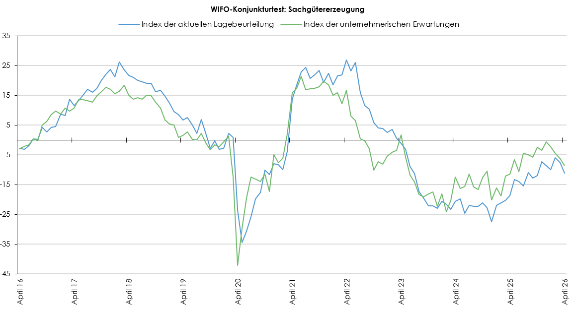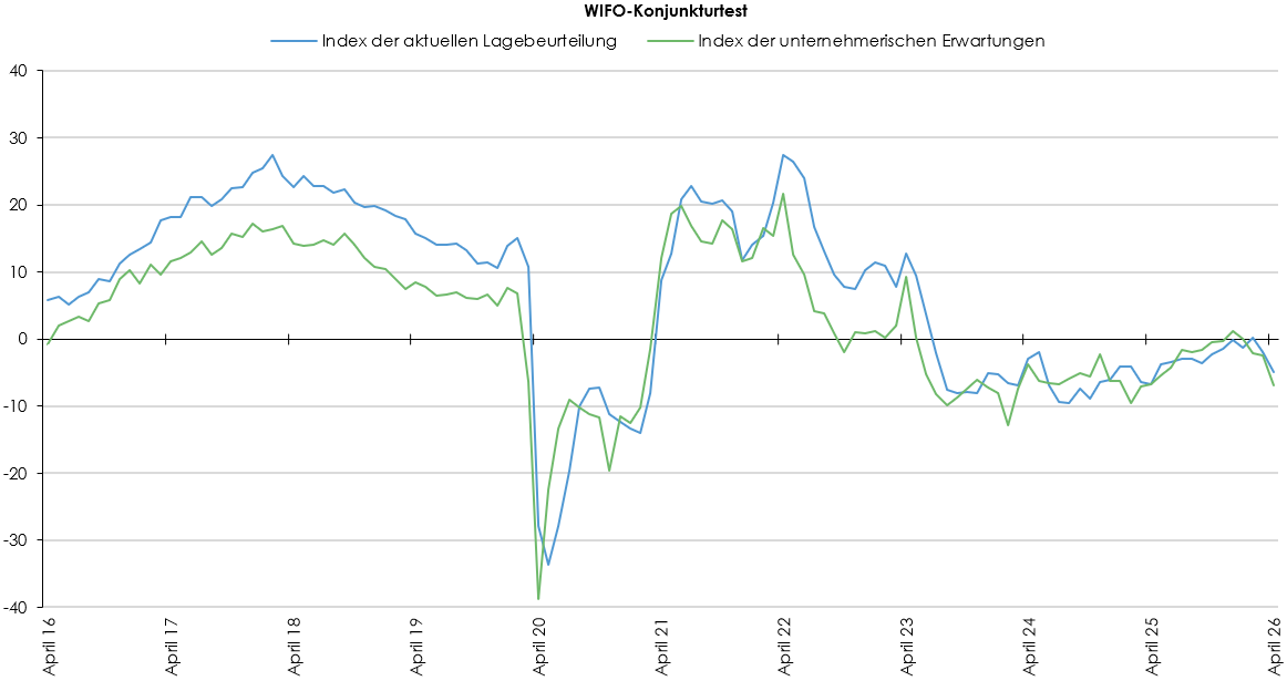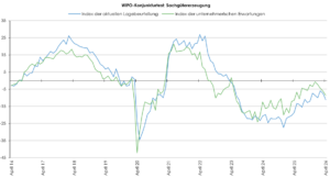 Der Index der aktuellen Lagebeurteilungen der Gesamtwirtschaft ging im April um 3,0 Punkte auf –4,9 Punkte zurück und notierte damit wieder tiefer unter der Nulllinie, die positive von negativen Lageeinschätzungen trennt. In der Sachgütererzeugung sank der Lageindex (–3,4 Punkte) und notierte mit –11,1 Punkten tief im skeptischen Bereich. In der Bauwirtschaft sank der Lageindex leicht (–0,9 Punkte) und notierte mit –3,1 Punkten unter der Nulllinie. In den Dienstleistungsbereichen verlor der Lageindex deutlicher an Dynamik (–3,6 Punkte) und notierte mit –2,5 Punkten erstmals seit April des Vorjahres im negativen Bereich. Im Einzelhandel zeigte sich ein geringfügiger Rückgang des Lageindex (–0,1 Punkt), der mit 0,0 Punkten an der Nulllinie notierte.