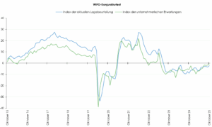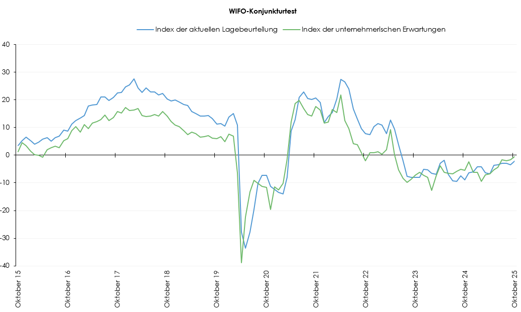 Der Index der aktuellen Lagebeurteilungen der Gesamtwirtschaft stieg im Oktober um 1,4 Punkte auf –2,2 Punkte an, blieb damit aber weiter unter der Nulllinie, die positive von negativen Lageeinschätzungen trennt. In der Sachgütererzeugung stieg der Lageindex leicht an (+1,2 Punkte), notierte aber mit –11,6 Punkten weiter deutlich unter der Nulllinie. In der Bauwirtschaft stieg der Lageindex um 2,3 Punkte und notierte mit 4,2 Punkten wieder deutlicher über der Nulllinie. Auch in den Dienstleistungsbereichen legte der Lageindex zu (+2,0 Punkte) und stieg mit 0,9 Punkten wieder knapp in den positiven Bereich. Im Einzelhandel zeigte sich eine Verschlechterung des Lageindex (–2,0 Punkte), der aber mit 1,4 Punkten nach wie vor im positiven Bereich notierte.