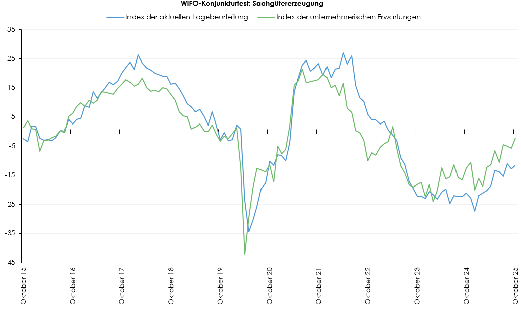 Der Index der unternehmerischen Erwartungen der Gesamtwirtschaft stieg im Oktober ebenfalls an (+1,2 Punkte) und blieb mit –0,5 Punkten nur noch knapp unter der Nulllinie, die negative von positiven Konjunkturerwartungen trennt. Im Einzelhandel stieg der Erwartungsindex leicht an (+1,0 Punkte) und notierte mit –10,6 Punkten weiter im Bereich skeptischer Konjunkturerwartungen. In den Dienstleistungsbereichen ging der Erwartungsindex leicht zurück (–0,3 Punkte), notierte aber mit 1,6 Punkten weiterhin knapp im positiven Bereich. In der Bauwirtschaft zeigte sich eine Verbesserung (+1,9 Punkte) und der Erwartungsindex notierte mit 4,4 Punkten über der Nulllinie. Auch in der Sachgütererzeugung stieg der Erwartungsindex im Oktober an (+3,5 Punkte), notierte aber mit –2,2 Punkten weiter im Bereich skeptischer Konjunkturerwartungen.