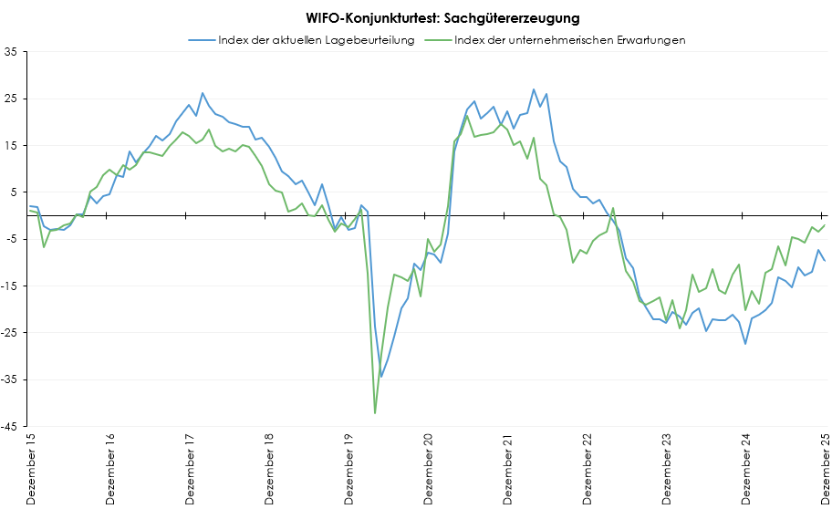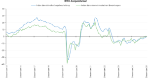 Auch der Index der unternehmerischen Erwartungen der Gesamtwirtschaft stieg im Dezember an (+0,9 Punkte) und lag mit 0,6 Punkten erstmals seit Mai 2023 knapp über der Nulllinie, die negative von positiven Konjunkturerwartungen trennt. Im Einzelhandel blieb der Erwartungsindex unverändert und notierte mit –13,6 Punkten weiter im Bereich skeptischer Konjunkturerwartungen. In den Dienstleistungsbereichen stieg der Erwartungsindex an (+1,8 Punkte) und notierte mit 5,4 Punkten höher im positiven Bereich. In der Bauwirtschaft hingegen zeigte sich eine Verschlechterung (–3,3 Punkte), der Erwartungsindex notierte mit 1,5 Punkten wieder knapper an der Nulllinie. In der Sachgütererzeugung stieg der Erwartungsindex im Dezember leicht an (+1,5 Punkte), notierte aber mit –2,0 Punkten weiterhin knapp im Bereich skeptischer Konjunkturerwartungen.