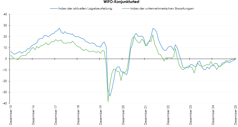 Der Index der aktuellen Lagebeurteilungen der Gesamtwirtschaft stieg im Dezember um 1,0 Punkte auf –0,4 Punkte an und blieb damit nur noch knapp unter der Nulllinie, die positive von negativen Lageeinschätzungen trennt. In der Sachgütererzeugung ging der Lageindex zurück (–2,5 Punkte) und notierte mit –9,7 Punkten wieder etwas tiefer unter der Nulllinie. In der Bauwirtschaft sank der Lageindex merklich (–6,9 Punkte) und notierte mit –1,3 Punkten wieder knapp im skeptischen Bereich. In den Dienstleistungsbereichen hingegen stieg der Lageindex deutlich an (+5,0 Punkte) und notierte mit 5,2 Punkten höher im positiven Bereich. Im Einzelhandel zeigte sich eine leichte Verbesserung des Lageindex (+0,4 Punkte), der mit 0,0 Punkten genau an der Nulllinie notierte.