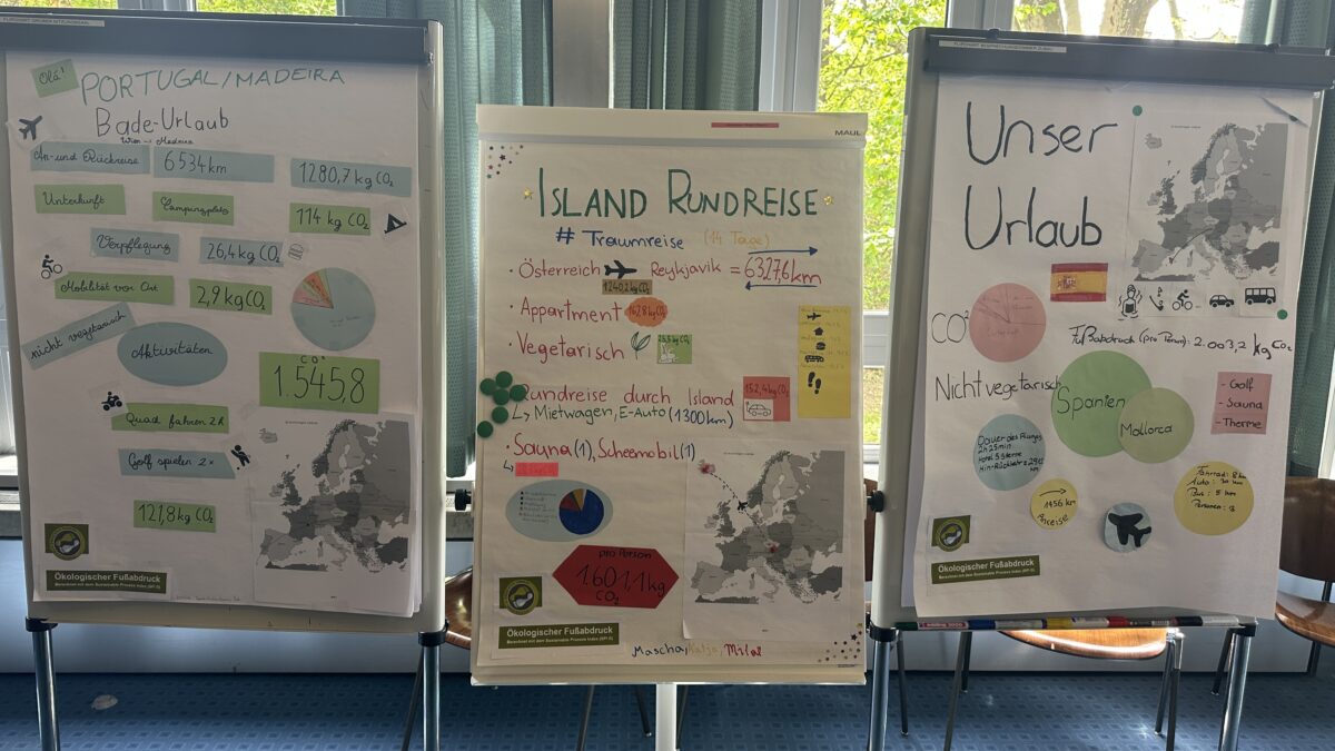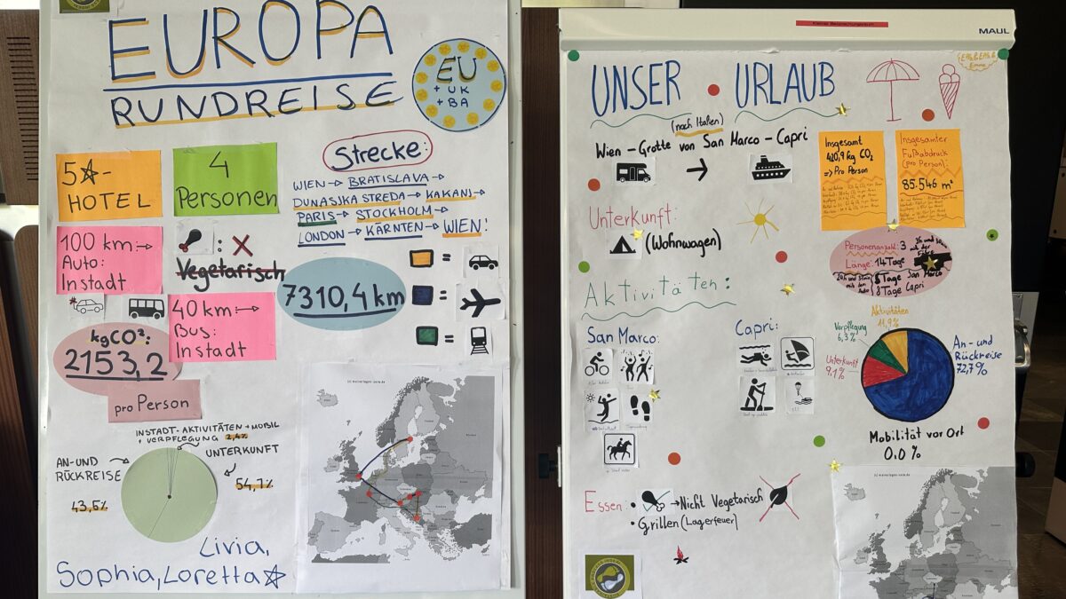 Neben dem starken Einfluss des Transportmittels auf die gesamte Menge der urlaubsbedingten Emissionen wurde auch der Einfluss der Ernährung (vegetarisch oder nicht) und verschiedener Aktivitäten (z. B. Thermenbesuche) transparent gemacht. Die Ergebnisse der Gruppenarbeiten wurden auf Plakaten festgehalten.