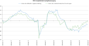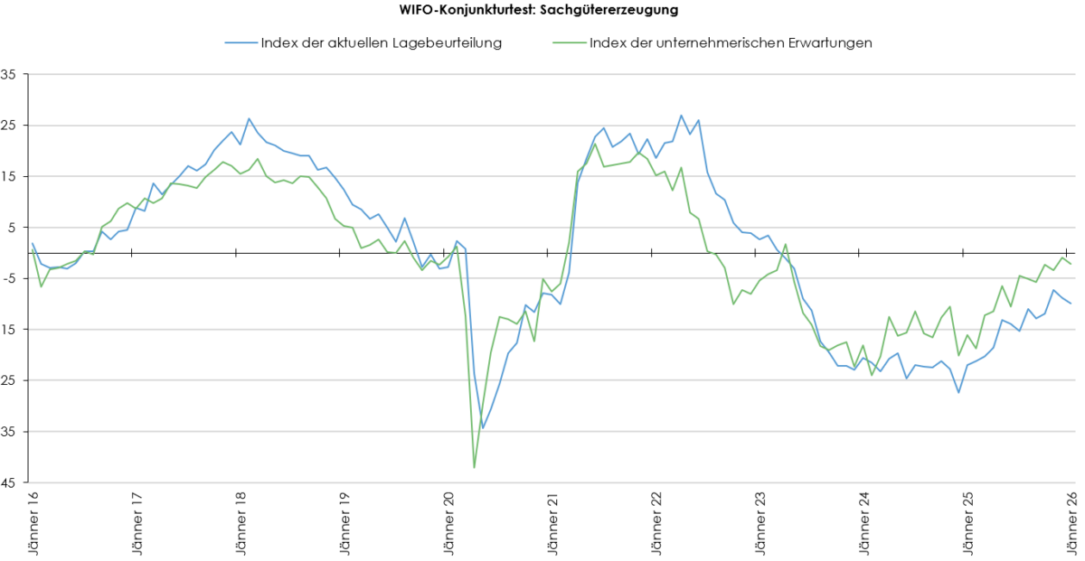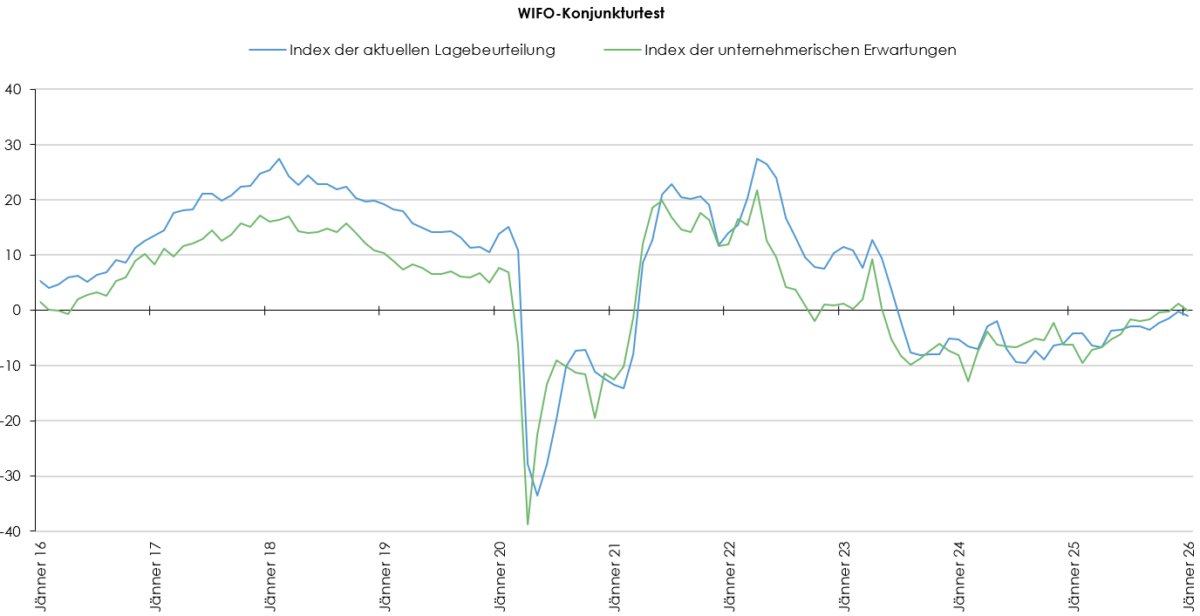 Auch der Index der unternehmerischen Erwartungen der Gesamtwirtschaft ging im Jänner zurück (–1,2 Punkte) und lag mit –0,1 Punkten wieder an der Nulllinie, die negative von positiven Konjunkturerwartungen trennt. Im Einzelhandel stieg der Erwartungsindex zwar an (+6,4 Punkte), notierte mit –7,4 Punkten jedoch nach wie vor im Bereich skeptischer Konjunkturerwartungen, aber auf einem für den Einzelhandel überdurchschnittlichen Niveau. In den Dienstleistungsbereichen hingegen sank der Erwartungsindex (–1,4 Punkte), notierte aber mit 3,2 Punkten weiter im zuversichtlichen Bereich. In der Bauwirtschaft zeigte sich eine Verschlechterung (–2,4 Punkte), der Erwartungsindex notierte mit –1,0 Punkten wieder unter der Nulllinie. Auch in der Sachgütererzeugung war der Erwartungsindex zu Jahresbeginn rückläufig (–1,2 Punkte) und notierte mit –2,2 Punkten weiterhin im Bereich skeptischer Konjunkturerwartungen.