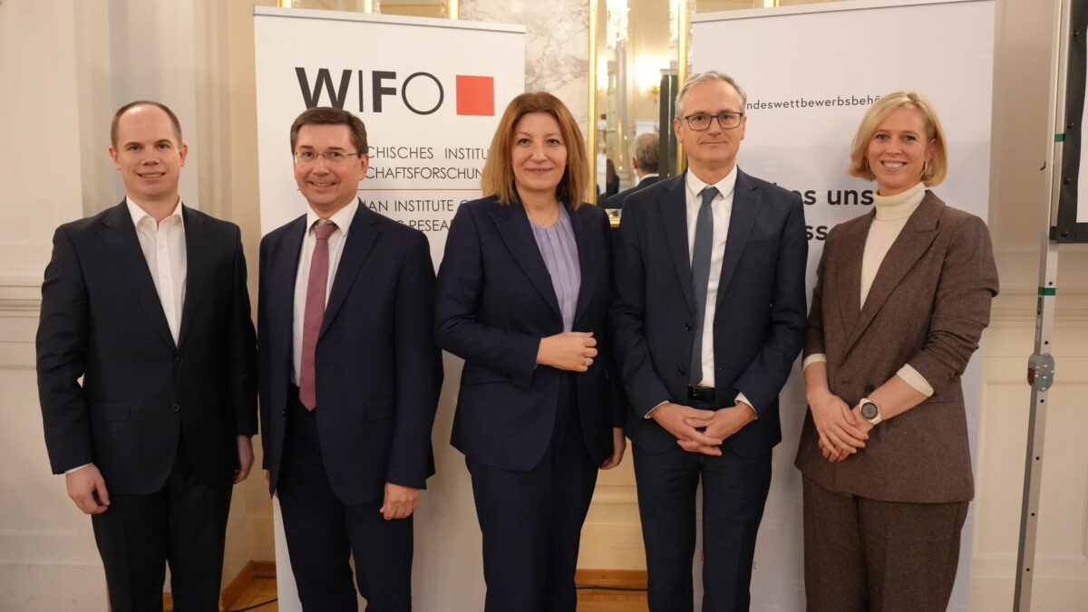 Im Fokus des Tages standen aktuelle Wirtschafts- und Wettbewerbsthemen. Natalie Harsdorf (BWB), Gabriel Felbermayr (WIFO), Helene Schuberth (ÖGB), Tobias Schweitzer (AK), Claudia Huber (WKÖ) und Justus Haucap (DICE – Düsseldorf Institute for Competition Economics) erörterten im ersten Block die "Industriestrategie Österreich" und wie es gelingt "zukunftsfit zwischen Industriepolitik und Ordnungspolitik" zu agieren. Moderatorin Andrea Hodoschek (Kurier) brachte die zentralen Herausforderungen der aktuellen wirtschaftspolitischen Debatte in die Runde ein. Hohe Inflation und der steigende Druck entlang der gesamten Wertschöpfungskette prägten die Diskussion. Ein gemeinsames Anliegen war es, die Wettbewerbsfähigkeit nachhaltig zu stärken. Entsprechend spannten die Beiträge den Bogen von konkreten wirtschaftspolitischen Weichenstellungen bis hin zu grundlegenden Fragen, etwa den Unterschieden zwischen Standort- und Industriepolitik. Deutlich wurde dabei, dass der Wettbewerb durchgehend als tragende Säule der Wirtschaftsordnung verstanden und konsequent in alle Überlegungen einbezogen wurde.