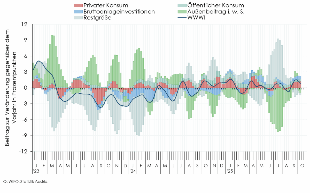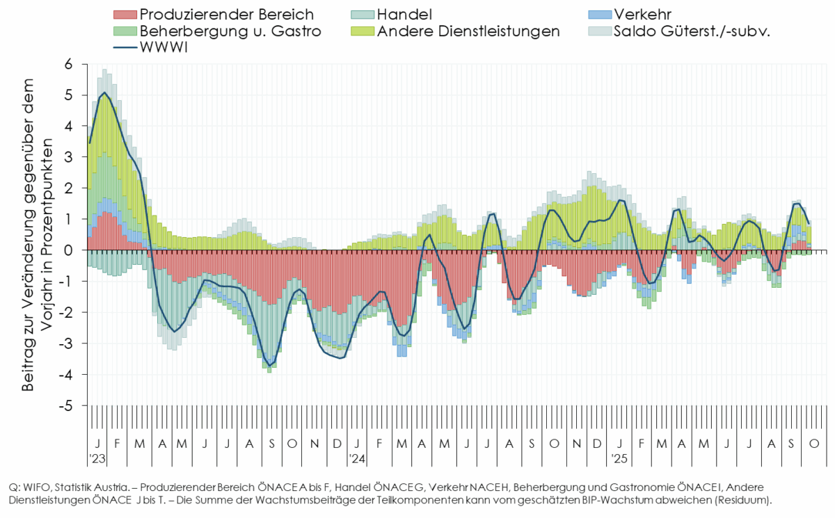 1) Die Berücksichtigung neu veröffentlichter und revidierter Monats- und Quartalsdaten, die bei der Schätzung des WWWI erfüllt werden müssen, führte zu einer Revision des WWWI für das BIP. Die neu veröffentlichte VGR-Jahresrechnung (30. September 2025), damit einhergehende Revisionen der Jahre 2021 bis 2023 und die damit verbundene Revision der Vierteljährlichen Volkwirtschaftlichen Gesamtrechnung bedingten eine Revision aller WWWI-Teilaggregate und erforderten eine Neuschätzung der zugrundeliegenden ökonometrischen Modelle. Zu nennenswerten entstehungsseitigen WWWI-Revisionen kam es insbesondere in den Bereichen Öffentliche Verwaltung (ÖNACE 2008, Abschnitte O bis Q), Bauwirtschaft (Abschnitt F), Verkehr (Abschnitt H), Beherbergung und Gastronomie (Abschnitt I) und übrige Marktdienstleistungen (Abschnitte J bis N).