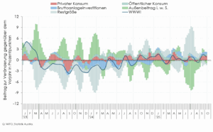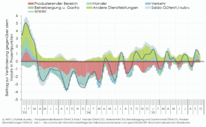 Aus der Entwicklung der Industrieproduktion und des Tourismus sowie der großen Nachfragekomponenten und den daraus resultierenden Wirkungen auf den Außenhandel ergibt sich für die Nettoexporte i. w. S. ein negativer Wachstumsbeitrag zum BIP von 2½ Prozentpunkten im August und ¼ Prozentpunkt im September (Juli –7½ Prozentpunkte).