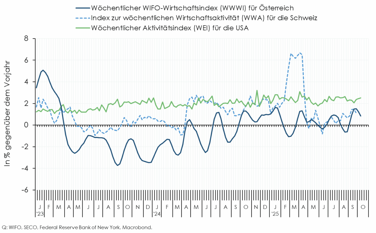 Die unbereinigte wirtschaftliche Aktivität gemessen am wöchentlichen Indikator für das reale BIP (WWWI) lag im August (Kalenderwochen 32 bis 35, 4. bis 31. August 2025) um ½% unter dem Vorjahresniveau und im September (Kalenderwochen 36 bis 39, 1. bis 28. September 2025) sowie in den ersten beiden Oktoberwochen (Kalenderwochen 40 und 41, 29. September bis 12. Oktober 2025) um jeweils 1% darüber.