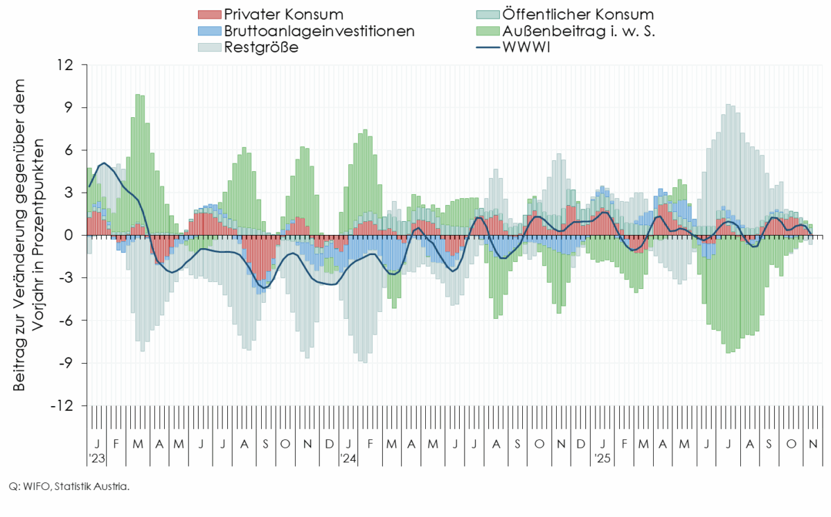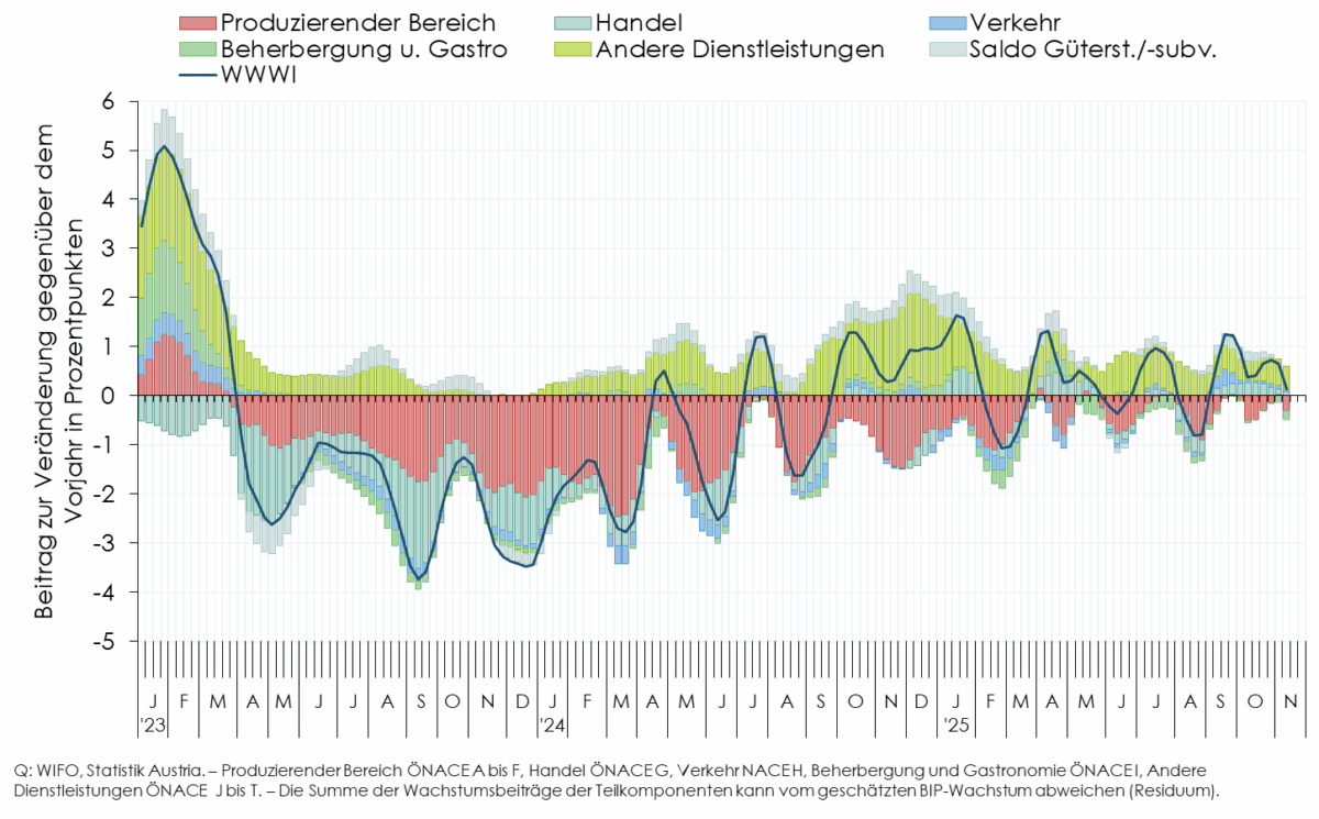 Auf Basis des wöchentlichen Indikators für das BIP (WWWI) ist die unbereinigte heimische Wirtschaftsleistung gegenüber dem Vorjahr im Oktober (Kalenderwochen 40 bis 44) und Anfang November (Kalenderwochen 45 und 46) um jeweils ½% gestiegen (September +¾%, revidiert)1).