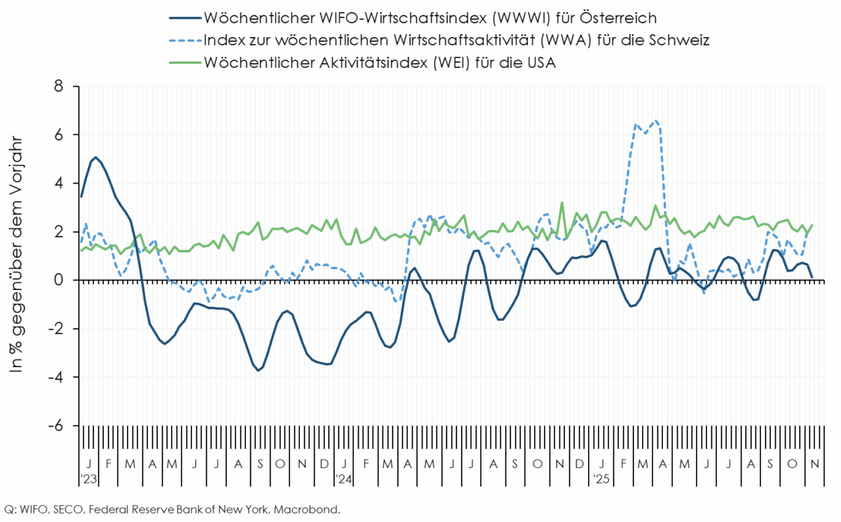 Die unbereinigte wirtschaftliche Aktivität gemessen am wöchentlichen Indikator für das reale BIP (WWWI) lag im Oktober (Kalenderwochen 40 bis 44, 29. September bis 2. November 2025) und in den ersten beiden Novemberwochen (Kalenderwochen 45 und 46, 3. bis 16. November 2025) um jeweils ½% über dem Vorjahresniveau.