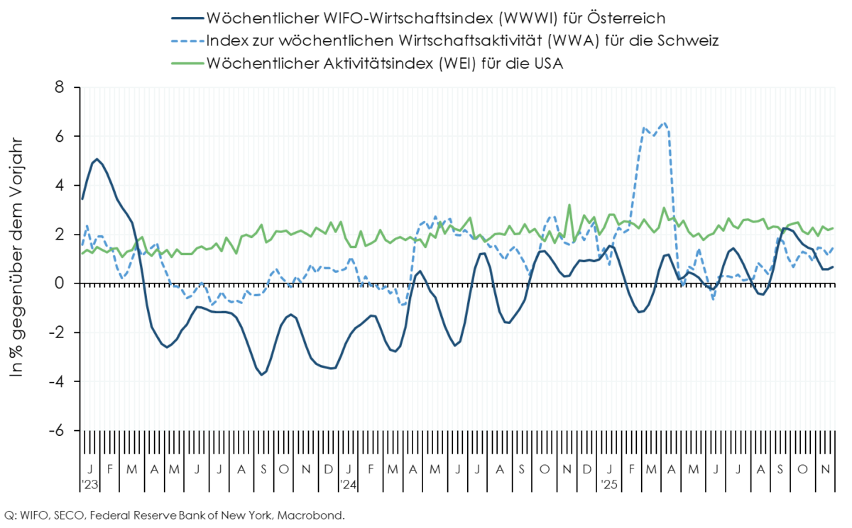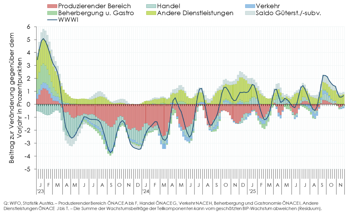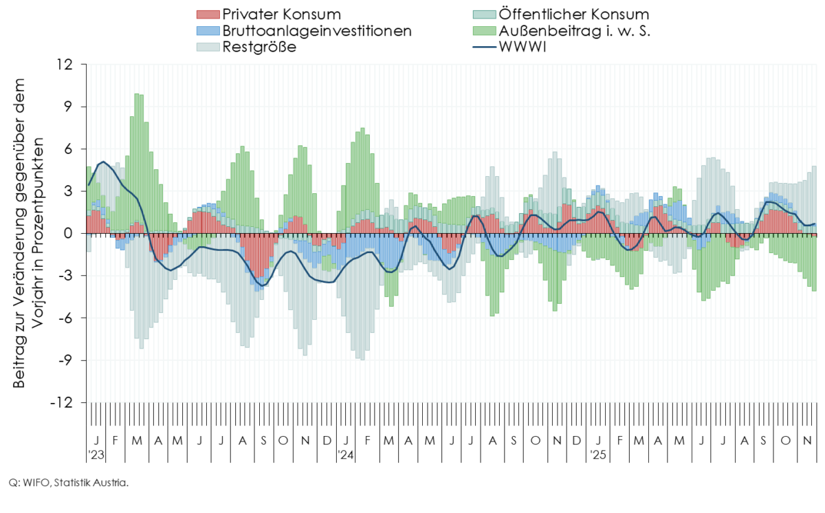 Auf Basis des wöchentlichen Indikators für das BIP (WWWI) ist die unbereinigte heimische Wirtschaftsleistung gegenüber dem Vorjahr im November (Kalenderwochen 45 bis 48) um ¾% gestiegen (Oktober +1¾%, revidiert)1).