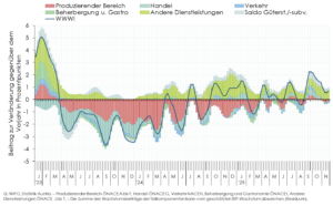 1) Die Berücksichtigung neu veröffentlichter und revidierter Monats- und Quartalsdaten, die bei der Schätzung des WWWI erfüllt werden müssen, führte zu einer Revision des WWWI für das BIP. Zu nennenswerten entstehungsseitigen WWWI-Revisionen kam es insbesondere in den Bereichen Güterproduktion (ÖNACE 2008, Abschnitte A bis E), öffentliche Verwaltung i. w. S. (Abschnitte O bis Q), Handel (Abschnitt G) und übrige Marktdienstleistungen (Abschnitte J bis N).