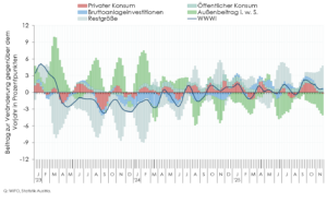 Auf Basis der Entwicklung der Industrieproduktion und des Tourismus sowie der großen Nachfragekomponenten und den daraus resultierenden Wirkungen auf den Außenhandel ergibt sich im November aus den Nettoexporten i. w. S. ein negativer Wachstumsbeitrag zum BIP von 3½ Prozentpunkten (Oktober –2 Prozentpunkte).