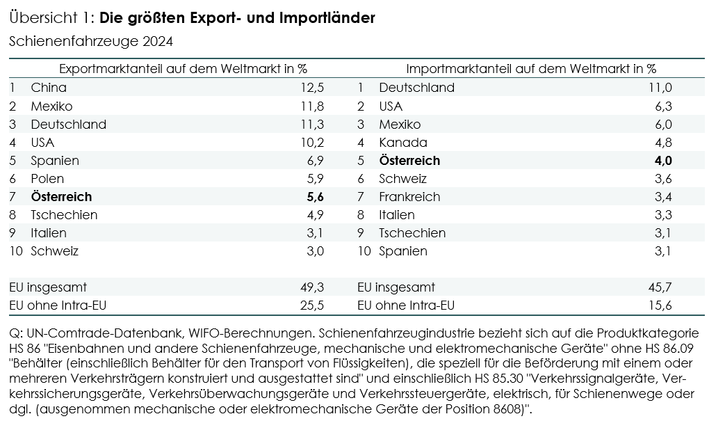 Die Schienenfahrzeugindustrie in Europa und Österreich ist stark und wettbewerbsfähig. Das geht aus einer aktuellen WIFO-Studie im Auftrag des Bundesministeriums für Innovation, Mobilität und Infrastruktur (BMIMI) hervor. Österreich hatte 2024 einen Exportweltmarktanteil von 5,6% und war das fünftgrößte Exportland. Europa hat einen Exportweltmarkanteil von rund 49,3% (ohne Intra-EU-Handel 25,5%) und einen Weltimportanteil von 45,7% (ohne Intra-EU-Handel 15,6%). WIFO-Ökonom Werner Hölzl präsentierte die Ergebnisse am 12. Februar 2026 gemeinsam mit Infrastrukturminister Peter Hanke im Rahmen eines Pressegesprächs.